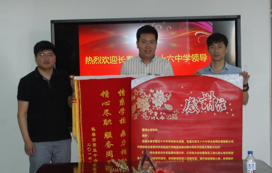 進(jìn)入驕陽似火的七月,我公司再傳喜訊。7月13日,長春市第五十六中學(xué)副校長柳鑫代表學(xué)校來到慧海科技,專程將感謝信與錦旗送到我公司,特別向我公司實(shí)施部員工宋凱對(duì)五十六中學(xué)素質(zhì)教育綜合評(píng)價(jià)系統(tǒng)運(yùn)行和快速發(fā)展過程中給予的幫助和支持表示感謝。